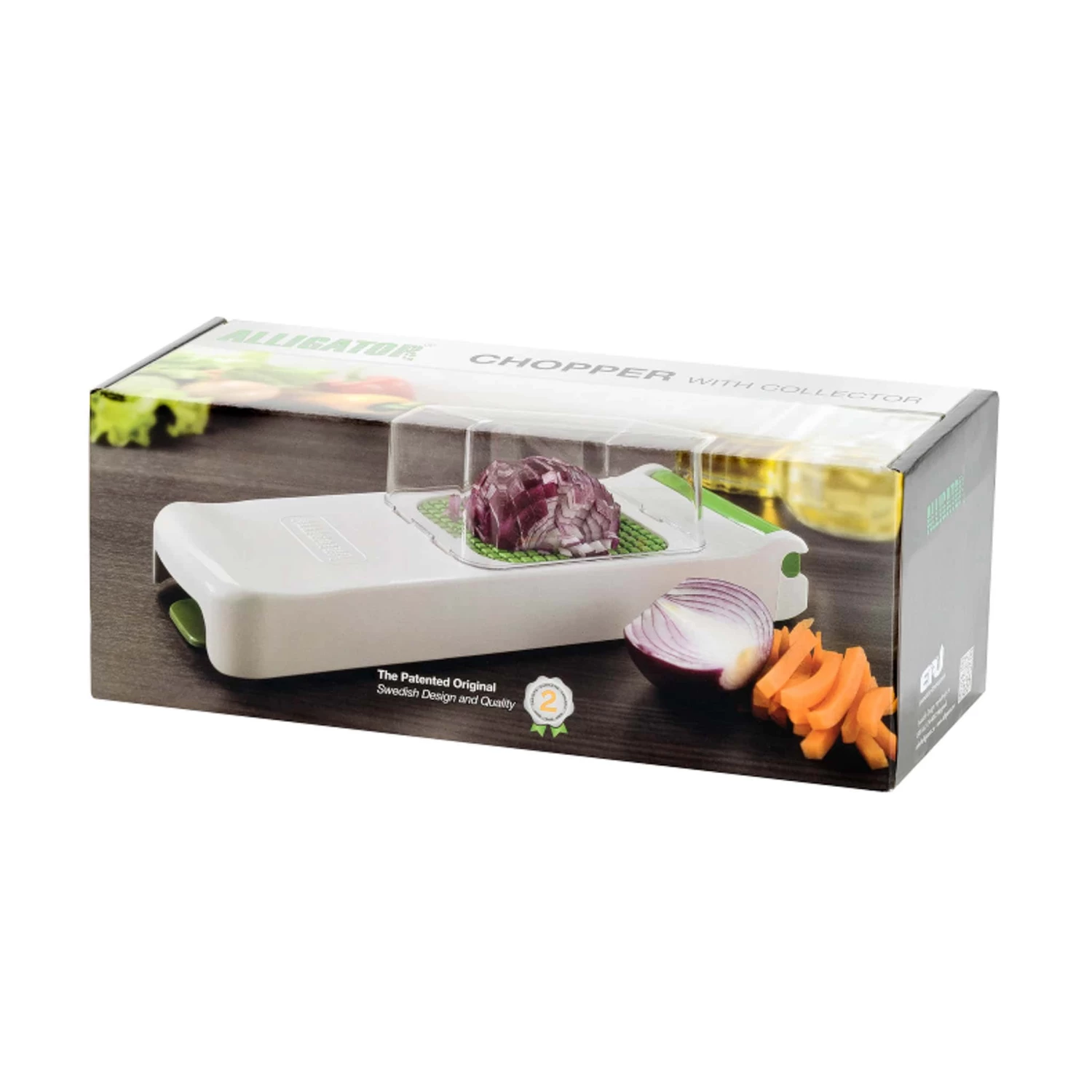 The Alligator original chopper is an essential kitchen gadget for busy home cooks. Designed and developed in Sweden, this clever tool has a 6x6mm grid of stainless steel blades that turns vegetables into evenly sized sticks or cubes with one stroke. The plastic collector collects what you have chopped, reducing worktop mess and protecting your eyes from onion fumes. The chopper has rubber feet to keep it stable and a finger protection design to keep your fingers out of reach of the sharp blades.