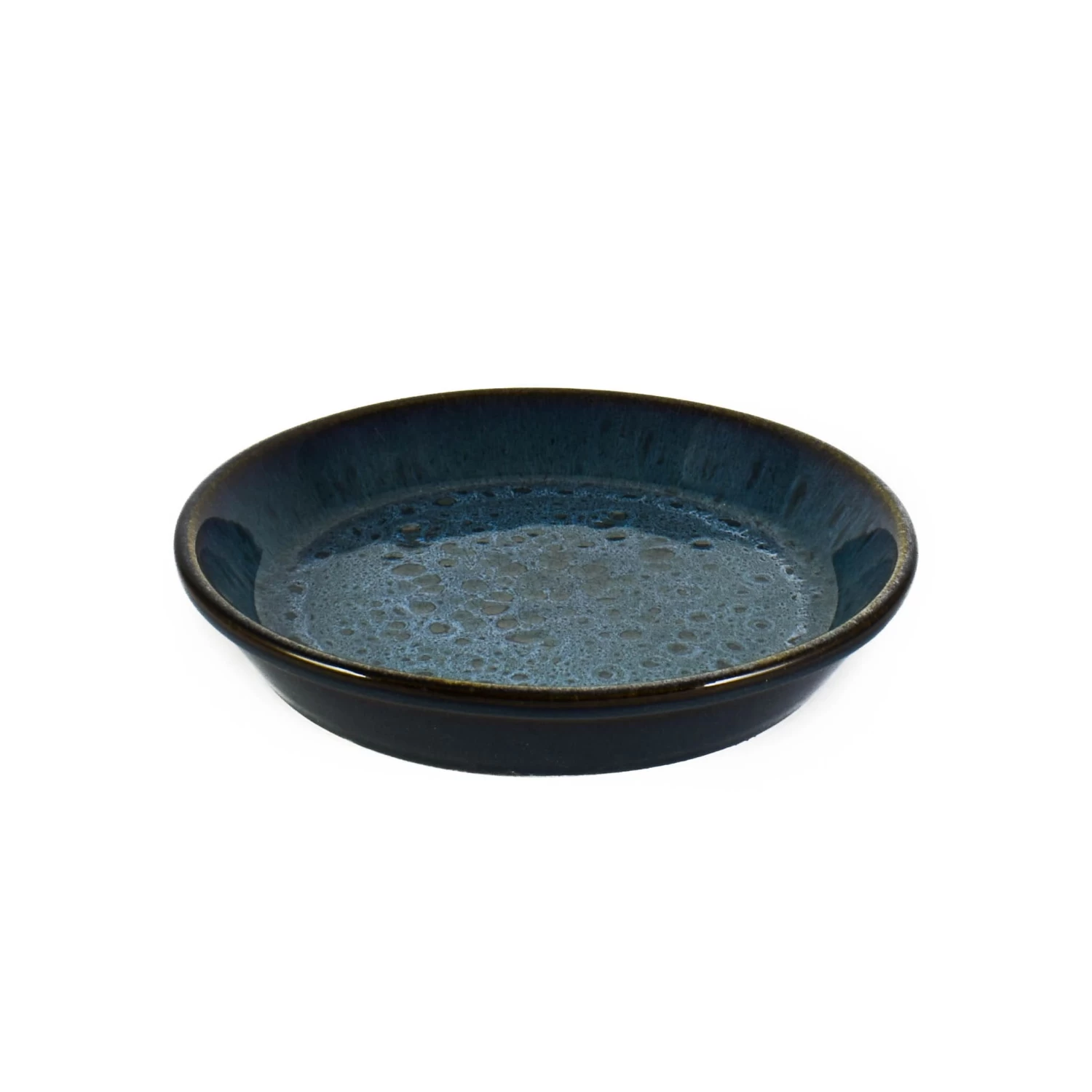The blue glaze has a beautiful marbled effect in shades of turquoise, sapphire and Aegean blue. It resembles a deep water ocean, with bubbles rising to the surface. The blue-black rim adds dimension and elegance. Every piece of blue glaze stoneware is handmade in small batches by artisans, so each one is unique.