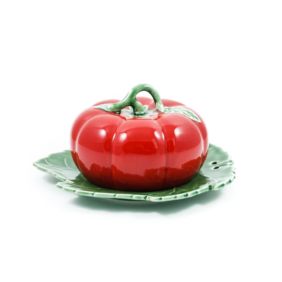 Add a touch of rural whimsy to your kitchen with the round tomato butter dish. The leaf-shaped base has a dish for the butter, and the giant tomato is the lid!