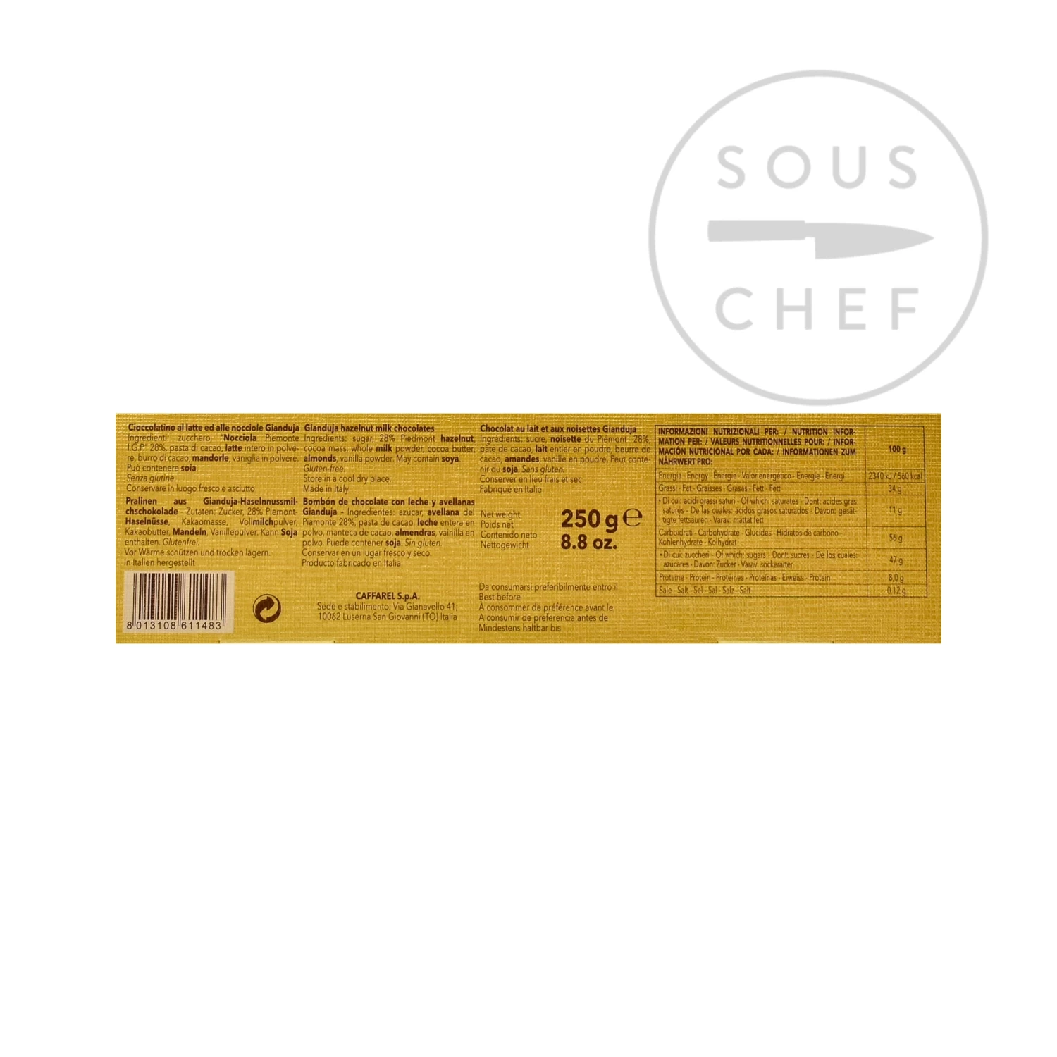 Ingredients: sugar, Piedmont hazelnut IGP (28%), cocoa mass, whole milk powder, cocoa butter, almonds, vanilla powder. May contain soya.