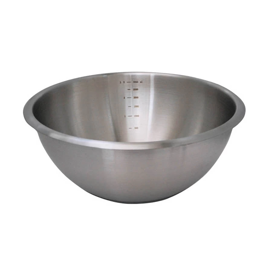 The De Buyer hemisphere mixing bowl is 30cm in diameter and has a capacity of 7 litres. A scale is laser-engraved on the inside, so you can see at a glance the volume of ingredients or mixture in the bowl.
