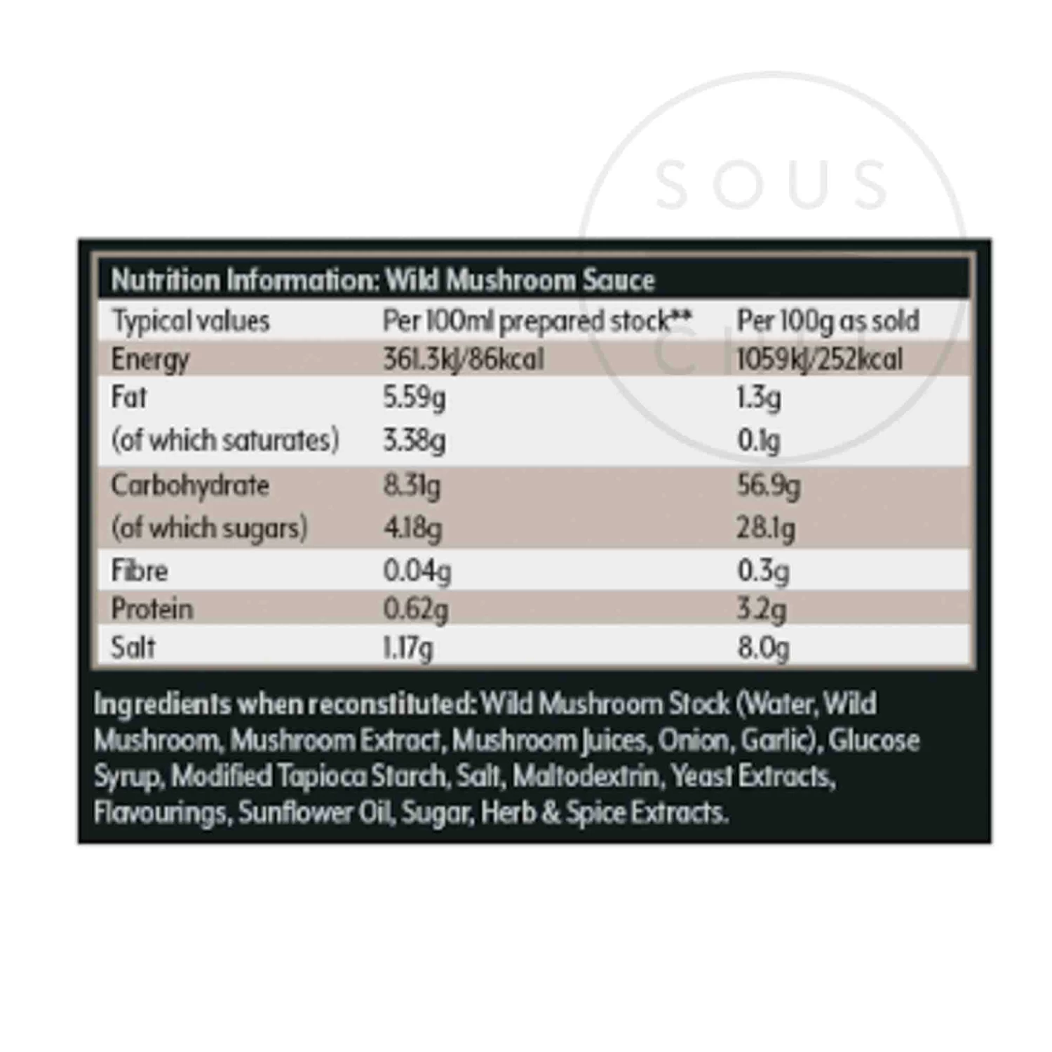 Ingredients: Wild mushroom stock (water, wild mushroom, mushroom extract, mushroom juices, onion, garlic), modified tapioca starch, glucose syrup, salt, maltodextrin, yeast extracts, sunflower oil, flavourings, sugar, herb & spice extracts.