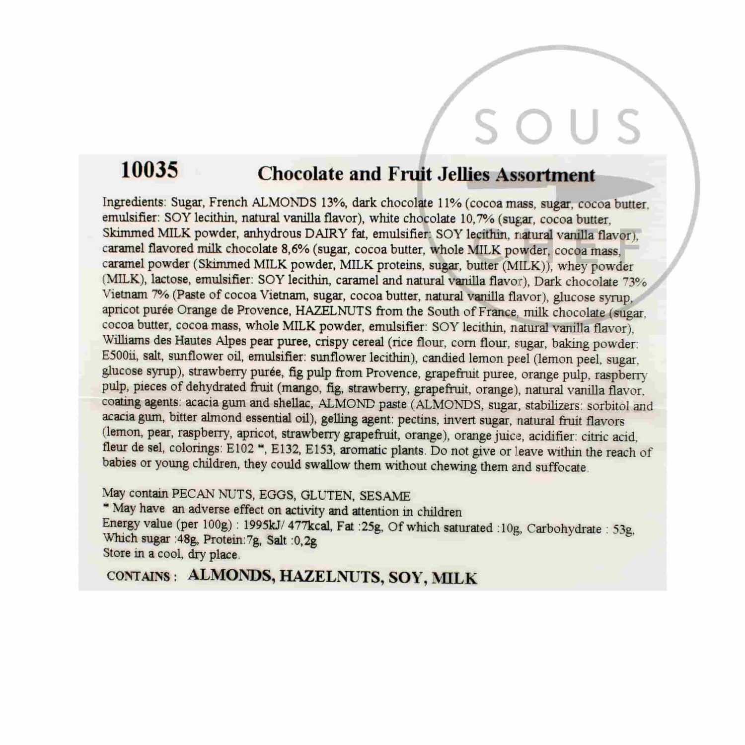 Ingredients: Sugar, 13% French almonds, 11% dark chocolate (cocoa mass, sugar, cocoa butter, emulsifier: soy lecithin, natural vanilla flavour), white chocolate 10.7% (sugar, cocoa butter, skimmed milk powder, anhydrous dairy fat, emulsifier: soy lecithin, natural vanilla flavour), caramel flavoured milk chocolate 8.6% (sugar, cocoa butter, whole milk powder, cocoa mass, caramel powder (skimmed milk powder, milk proteins, sugar, butter (milk)), whey powder (milk), lactose, emulsifier: soy lecithin, caramel and natural vanilla flavour), dark chocolate 73% Vietnam 7% (paste of cocoa Vietnam, sugar, cocoa butter, natural vanilla flavour), glucose syrup, apricot puree orange de Provence, hazelnuts from the South of France, milk chocolate (sugar, cocoa butter, cocoa mass, whole milk powder, emulsifier: soy lecithin, natural vanilla flavour), Williams des Hautes Alpes pear puree, crispy cereal (rice flour, corn flour, sugar, baking powder: E500ii, salt, sunflower oil, emulsifier: sunflower lecithin), candied lemon peel (lemon peel, sugar, glucose syrup), strawberry puree, fig pulp from Provence, grapefruit puree, orange pulp, raspberry pulp, pieces of dehydrated fruit (mango, fig, strawberry, grapefruit, orange), natural vanilla flavour, coating agents: acacia gum and shellac, almond paste (almonds, sugar, stabilisers: sorbitol and acacia gum, bitter almond essential oil), gelling agent: pectins, invert sugar, natural fruit flavours (lemon, pear, raspberry, apricot, strawberry, grapefruit, orange), orange juice, acidifier: citric acid, fleur de sel, colourings: E102*, E132, E153, aromatic plants.