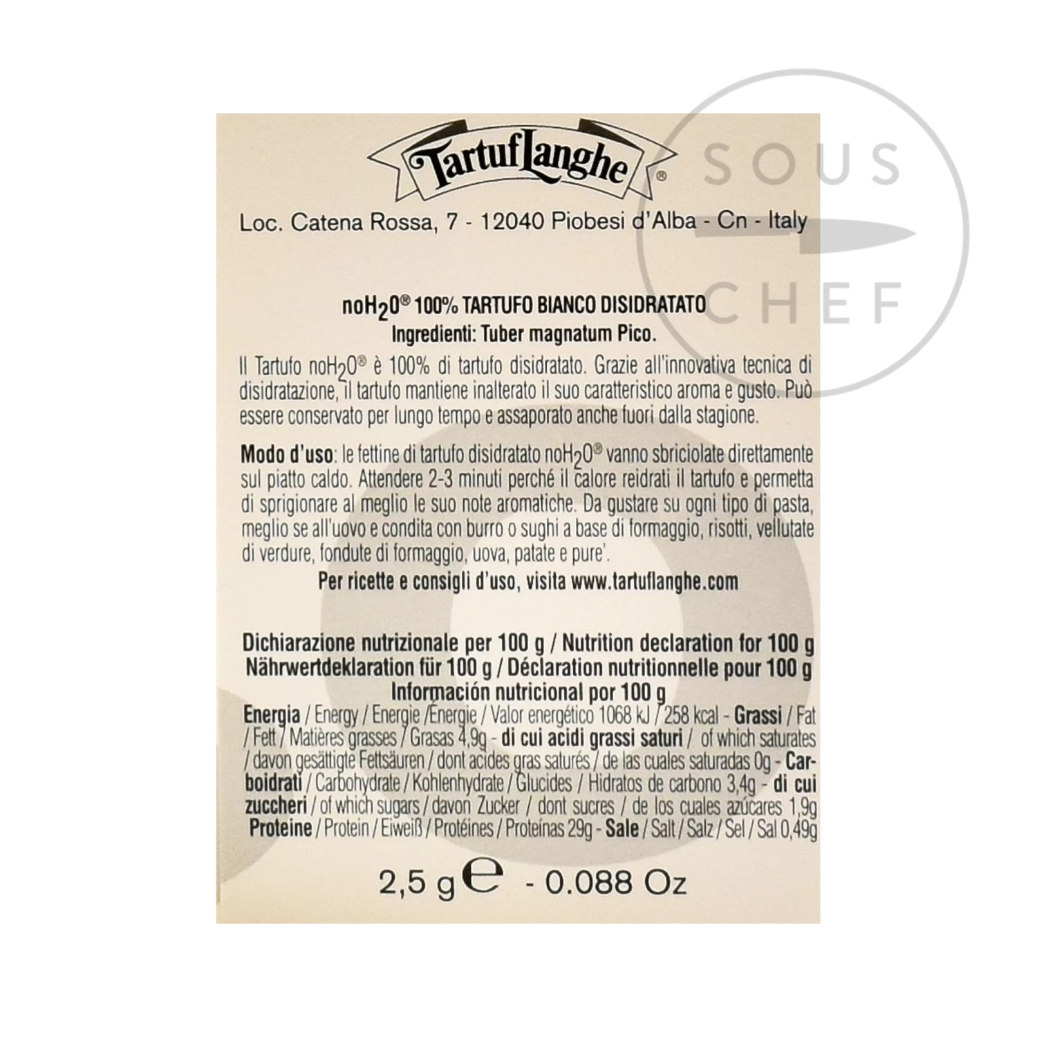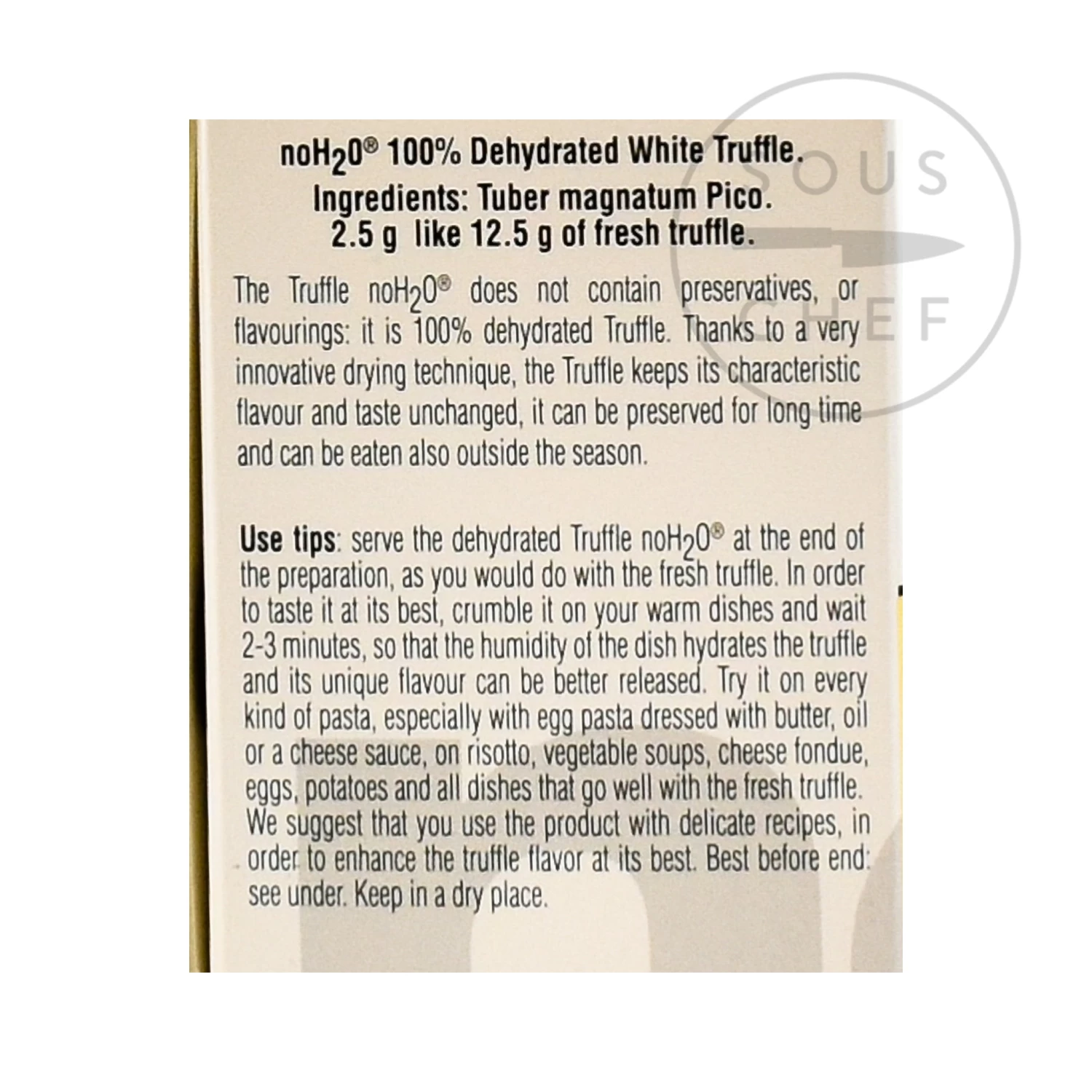 Ingredients: 100% dehydrated white truffle (Tuber magnatum Pico). 12.5g of fresh truffle per 2.5g of final product.