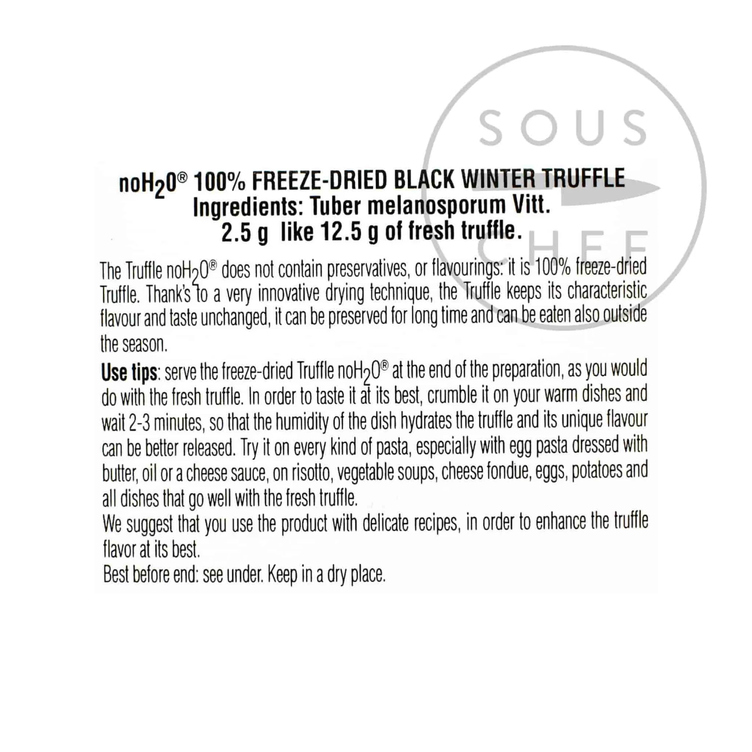 Ingredients: 100% freeze-dried black winter truffle (Tuber melanosporum Vitt). 12.5g of fresh truffle per 2.5g of final product.