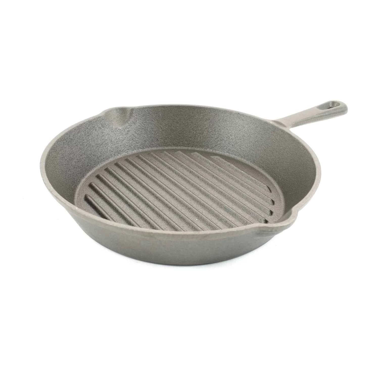 The cast iron grill pan is versatile and resilient. It’s fantastic for searing steaks and fish, or for griddling vegetables. The ridged pan base allows fat to drain away from meat as it cooks, giving you lovely smoky bar-marks. It’s also a brilliant pan for making flat-breads with a simple flour and yoghurt dough.