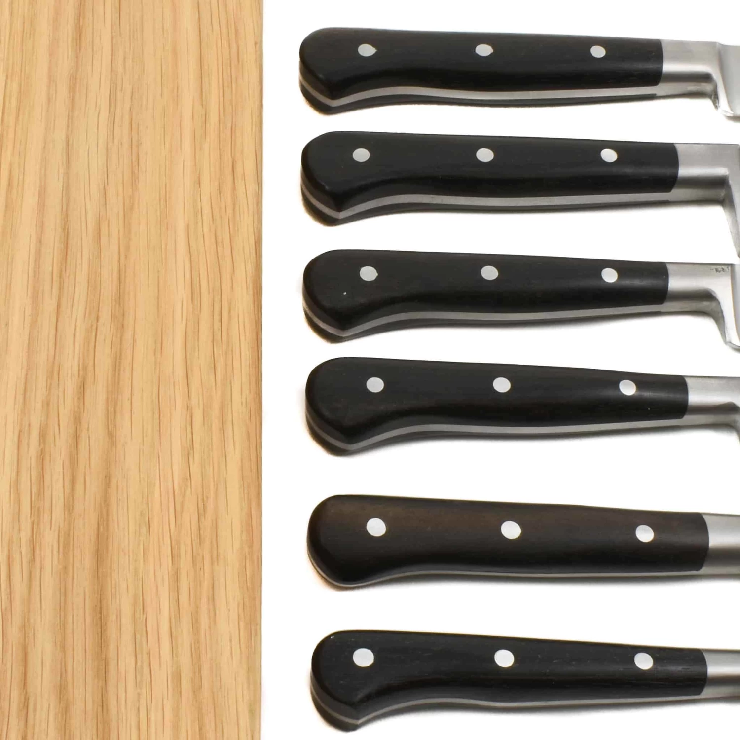 The Laguiole en Aubrac classic knife block with 6 ebony-handled kitchen knives is a stunning display of knive. Each stainless steel knife has a beautiful Ebony wood black handle that looks elegant and classic in any kitchen. The magnetic oak wood block makes a stylish display for this brilliant starter knife set.