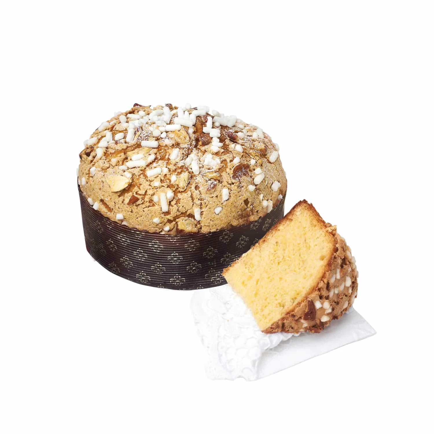 Ingredients: Wheat flour, fresh eggs raised on the ground in italy, sugar, fresh butter (milk) (12%), almond icing (12%) [sugar, egg white, sunflower oil, italian “tuono” almonds (28%), pre-cooked rice and wheat flour, natural flavours], grains of sugar (8%), natural sourdough yeast (wheat), emulsifier: mono and diglycerides of vegetable origin fatty acids, wildflower honey from sicily, fresh cream (milk) (2%), fresh milk (1%), cervia whole marine salt, cocoa butter, natural mananara vanilla from madagascar* (0,2%), blend of selected spices (0,1%), natural flavours
