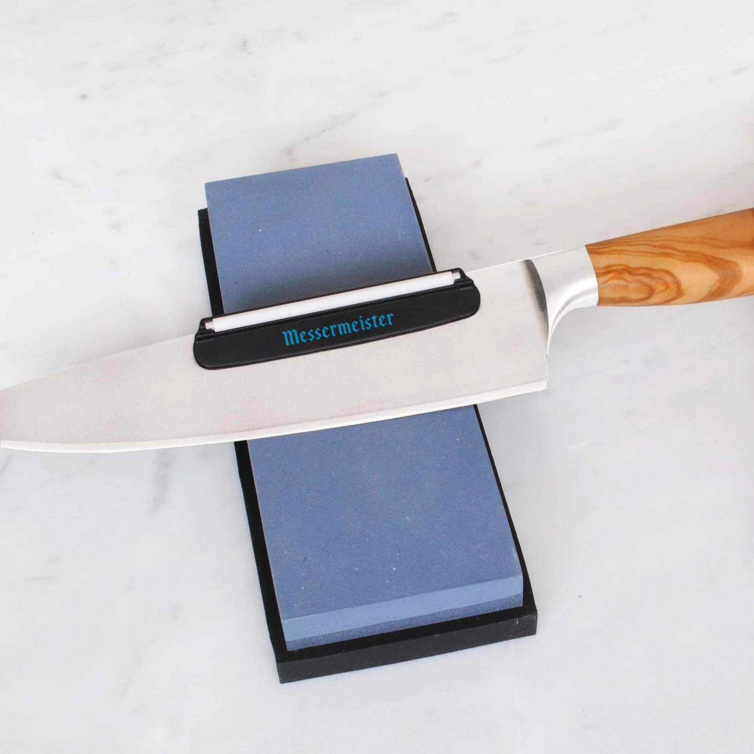 Messermeister’s sharpening guide makes whetstone sharpening easy and efficient. The ceramic guides are a simple way to maintain the perfect edge angle when using a whetstone. Clip the guide to the spine of your knife and maintain contact with the stone throughout the sharpening process. The ceramic guide smoothly glides across the whetstone at a precise distance, producing a perfect 15 degree angle.