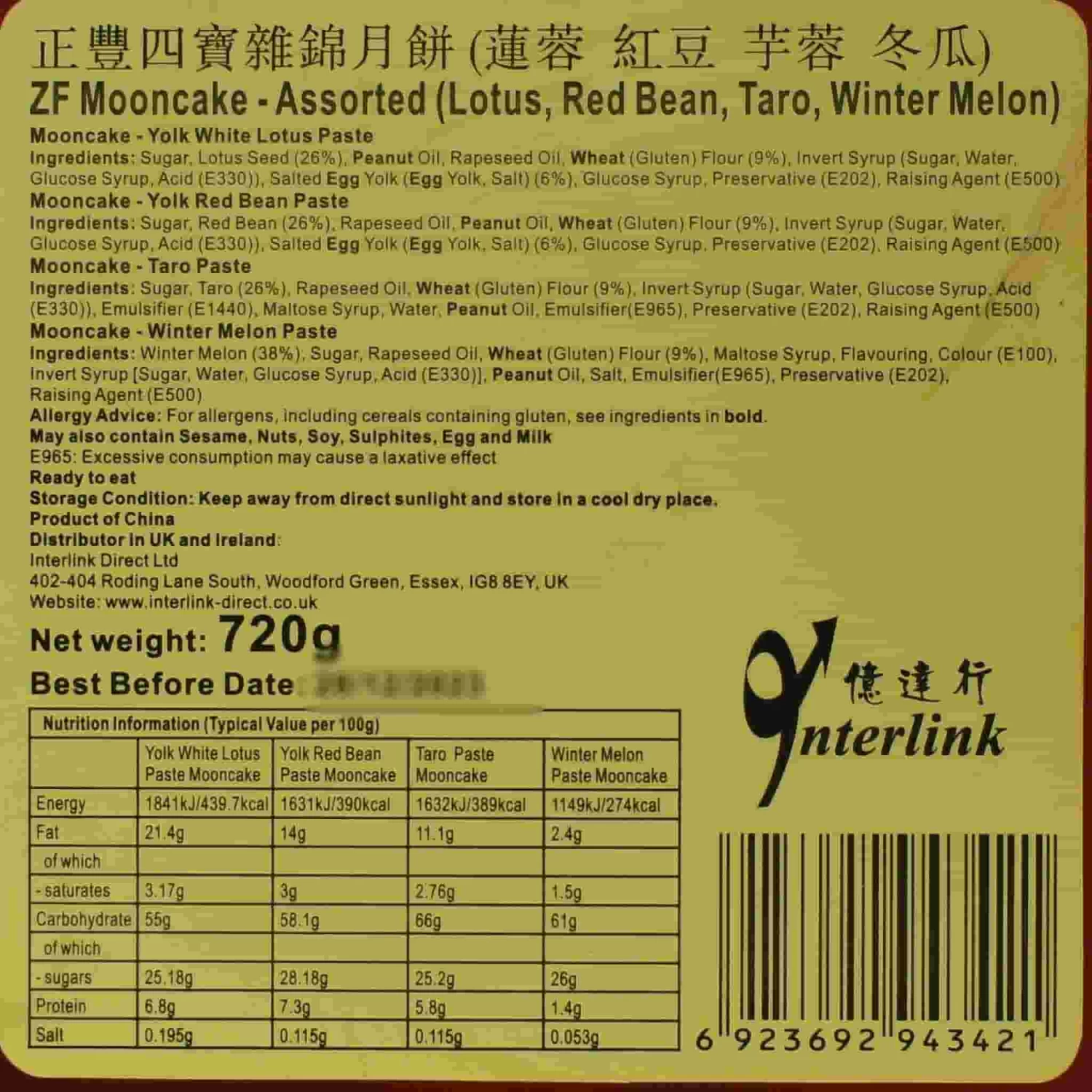 Ingredients: Yolk with white lotus paste: sugar, lotus seed (26%), peanut oil, wheat flour (9%), rapeseed oil, salted egg yolk (6%), glucose syrup, invert syrup (sugar, water, glucose syrup, acid (e330)), preservative (e202), raising agent (e500). Yolk red bean paste: sugar, red bean (26%), peanut oil, wheat flour (9%), rapeseed oil, salted egg yolk (6%), glucose syrup, invert syrup (sugar, water, glucose syrup, acid (e330)), preservative (e202), raising agent (e500). Taro paste: sugar, red bean (26%), wheat flour (9%), rapeseed oil, modified starch [emulsifier (e1440), stabiliser (e1442)], glucose syrup, invert syrup (sugar, water, peanut oil, glucose syrup, acid (e330)), preservative (e202) (e266), raising agent (e500), sweetener (e965). Winter melon paste: winter melon (38%), sugar, rapeseed oil, wheat flour (9%), malt syrup, salt, flavouring, colour (e100), invert syrup [sugar, water, glucose syrup, acid (e330)], peanut oil, preservative (e202), raising agent (e500).
