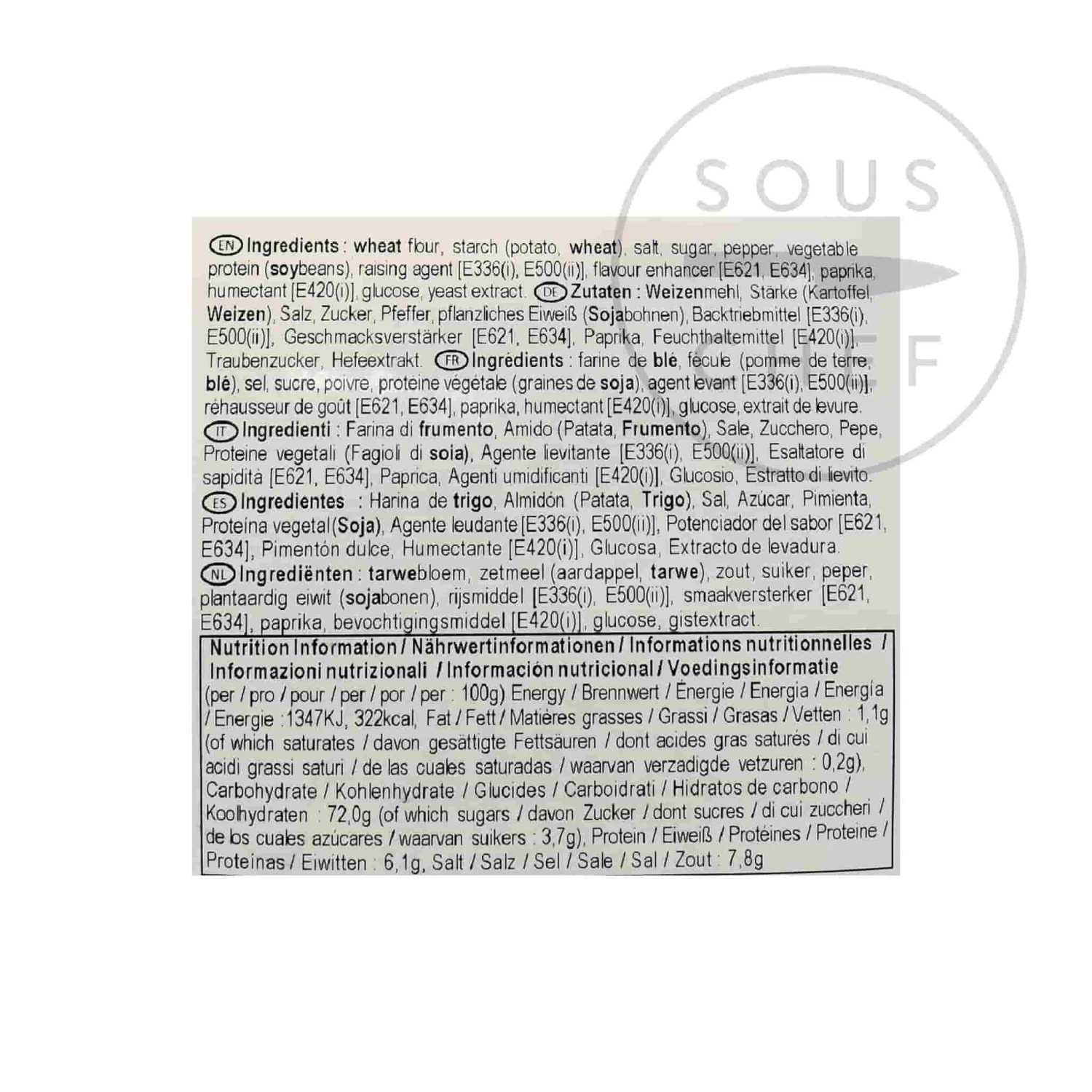 Ingredients: Wheat flour (gluten), starch (potato, wheat), salt, sugar, pepper, vegetable protein (soybeans), raising agents [e336(i), e500(ii)], flavour enhancers [e621, e634], paprika, humectant [e420(i)], glucose, yeast extract.