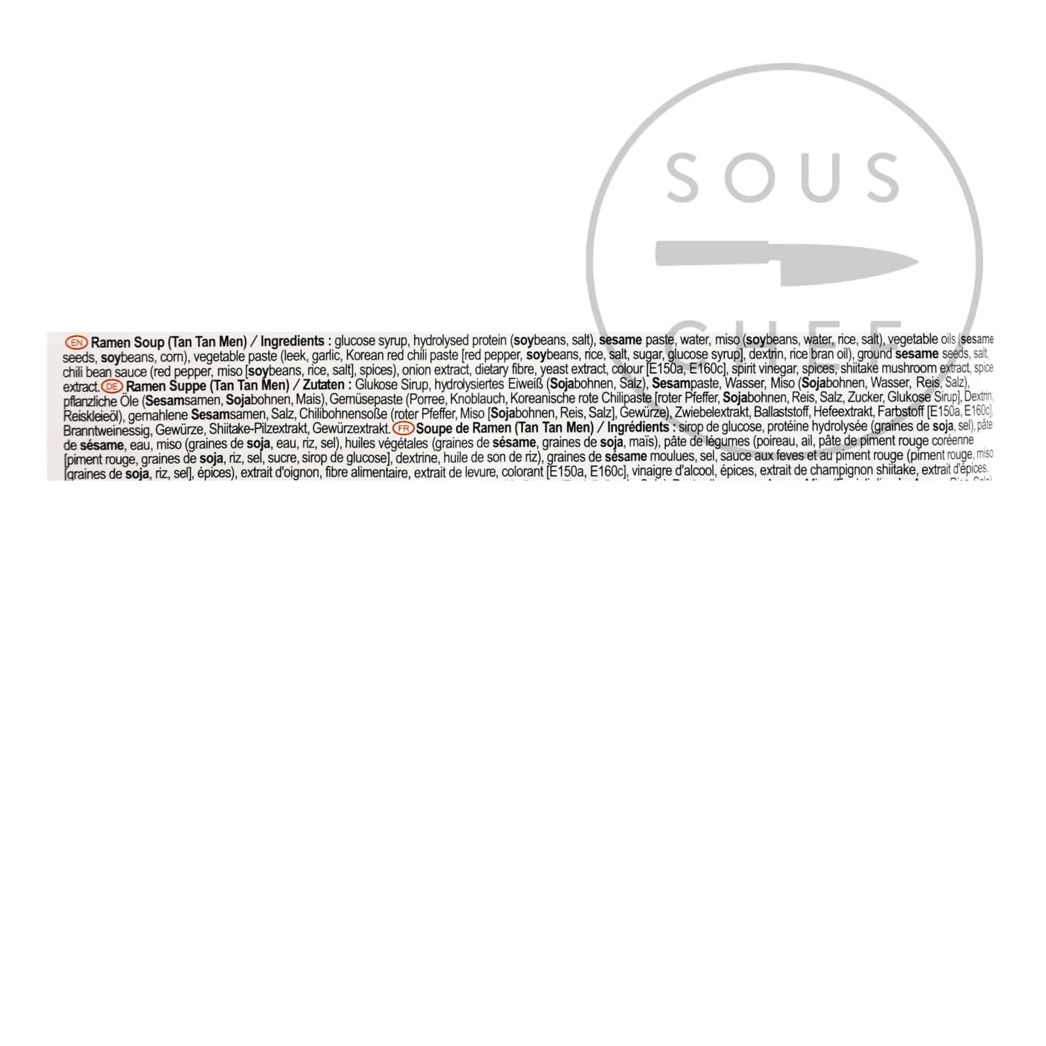 Ingredients: Glucose syrup, hydrolysed protein (soybeans, salt), sesame paste, water, miso (soybeans, water, rice, salt), vegetable oils (sesame seeds, soybeans, corn), vegetable paste (leek, garlic, Korean chilli paste (red pepper, soybeans, rice, salt,sugar, glucose syrup) dextrin, rice bran oil), ground sesame seeds, salt, chilli bean sauce (red pepper, miso *soybeans rice salt), spice), onion extract, dietary fibre, yeast extract, colour (E150a. E160c) spirit vinegar, spices, shiitake mushroom extract, spice extract.