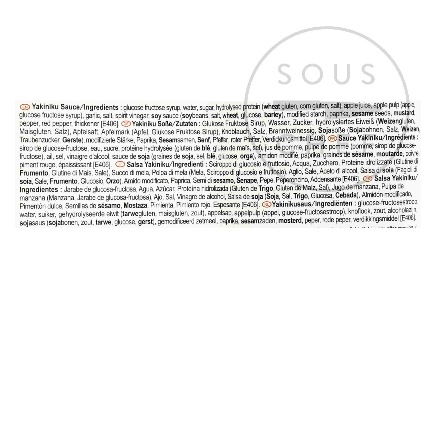 Ingredients: Soy sauce (water, wheat), sugar, fermented rice seasoning, concentrated apple juice, hydrolysed protein, vinegar (apple), stir fried onion, concentrated peach juice, vegetable oil, onion extract, garlic, concentrated lemon juice, sesame, salt, powdered garlic, yeast extract, animal fat, processed starch, seasoning (amino acids), thickener (xanthan), colourings.