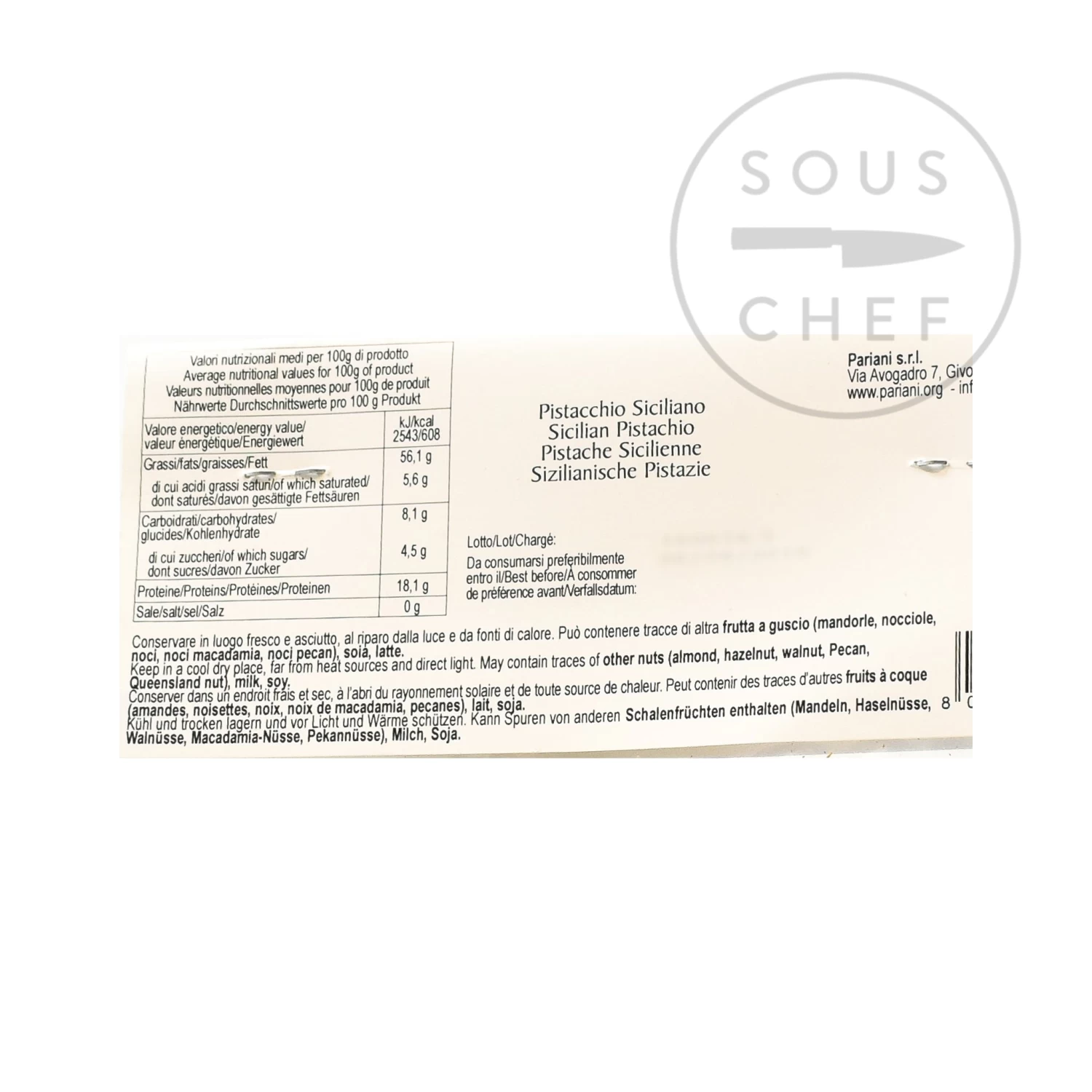Ingredients: Sicilian pistachios. Contains allergens: nuts. May contain traces of milk and soy.