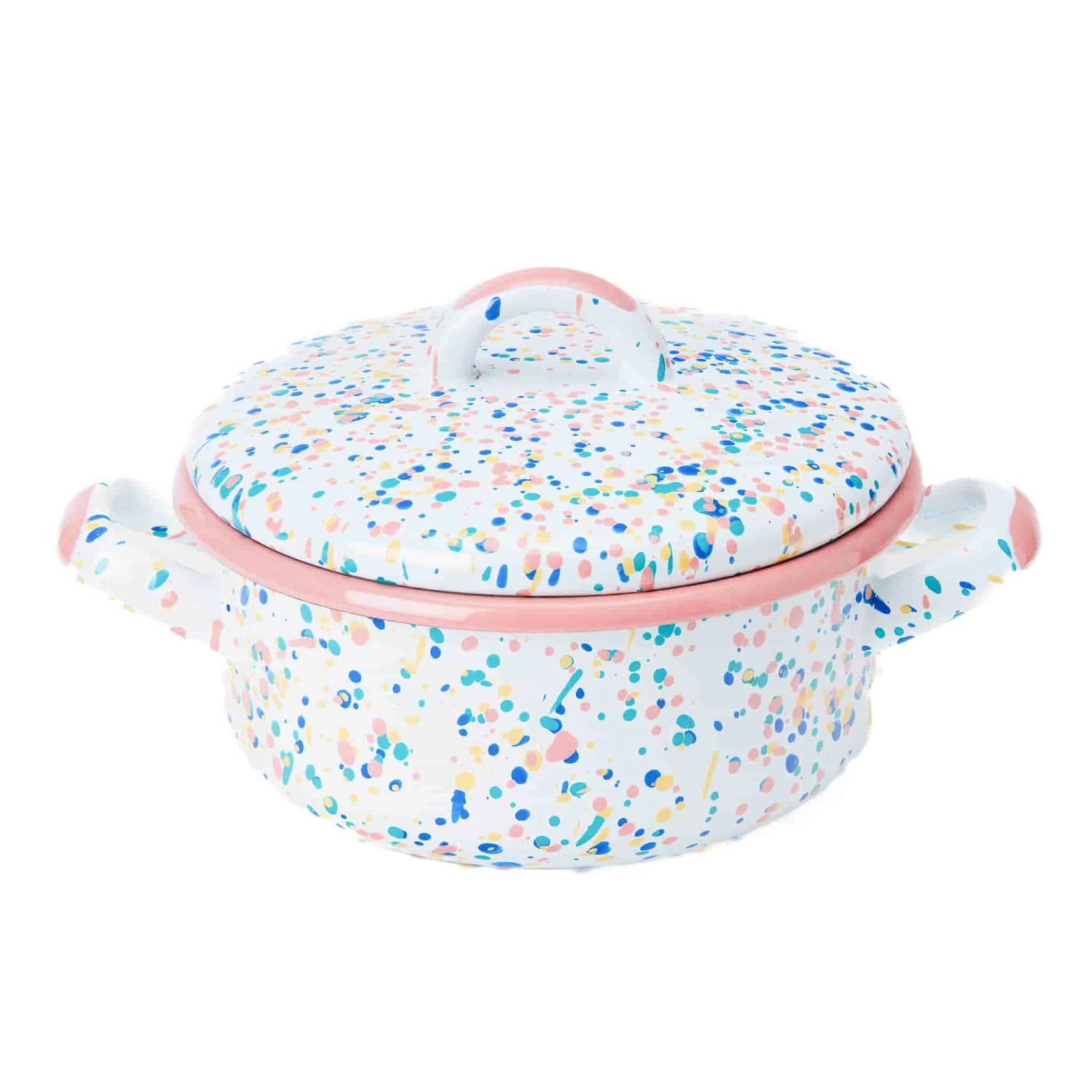 The pink dot enamel casserole is a cheerful way to cook and serve a spicy bean chilli or a slow-cooked chicken stew. The colourful paint splatter design and candy pink rim will instantly brighten up your kitchen countertop. The dish has a matching lid and handles for transporting food from oven to table – don’t forget the oven gloves! Use it to serve familiar favourites like minestrone soup or a hearty beef stew with dumplings.