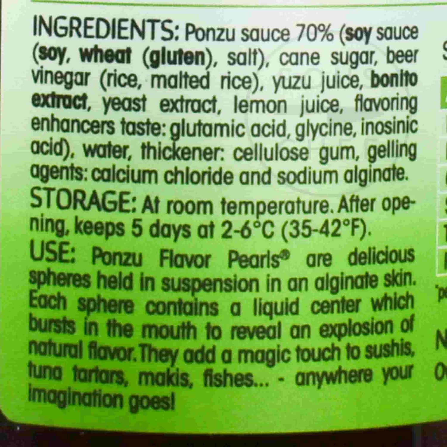 Ingredients: Ponzu sauce (UE/non UE) 70% (soy sauce (soy, wheat (gluten), salt), cane sugar, beer vinegar (rice, malted rice), yuzu juice, bonito extract, yeast extract, lemon juice, flavouring enhancers taste: E620 glutamic acid, E640 glycine, inosinic acid E630), water, thickener: cellulose gum, gelling: calcium chloride, sodium alginate.