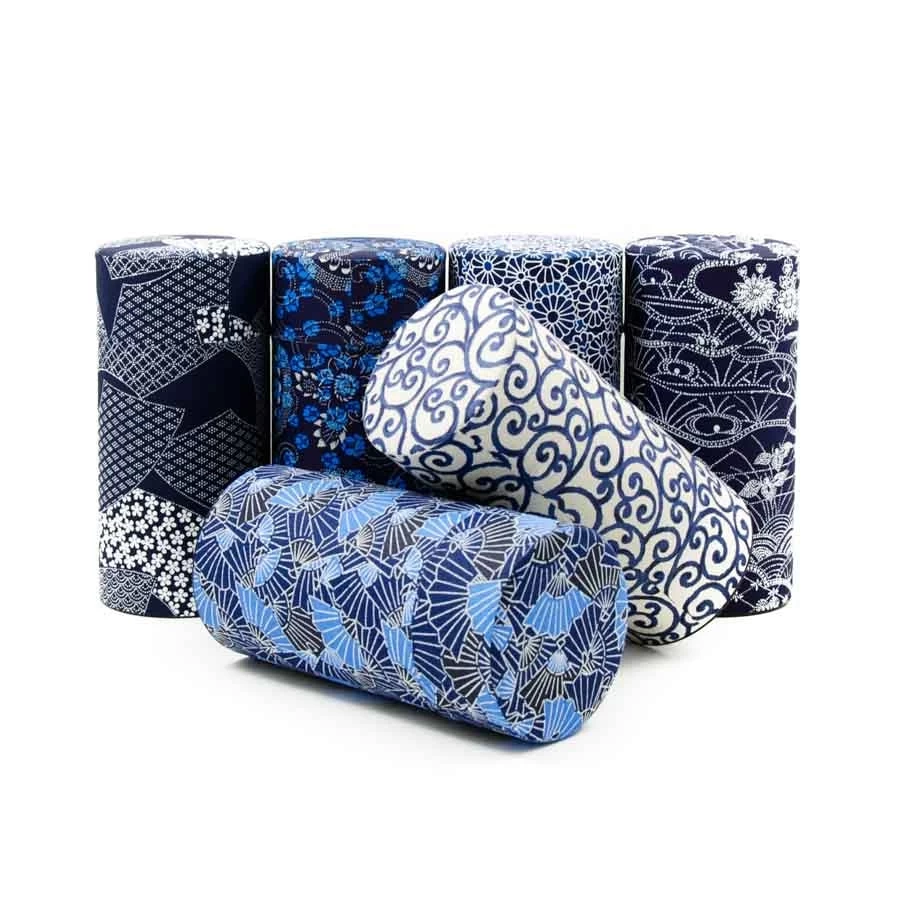 The tea caddies feature a medley of blue and white designs, each one reminiscent of traditional kimonos.