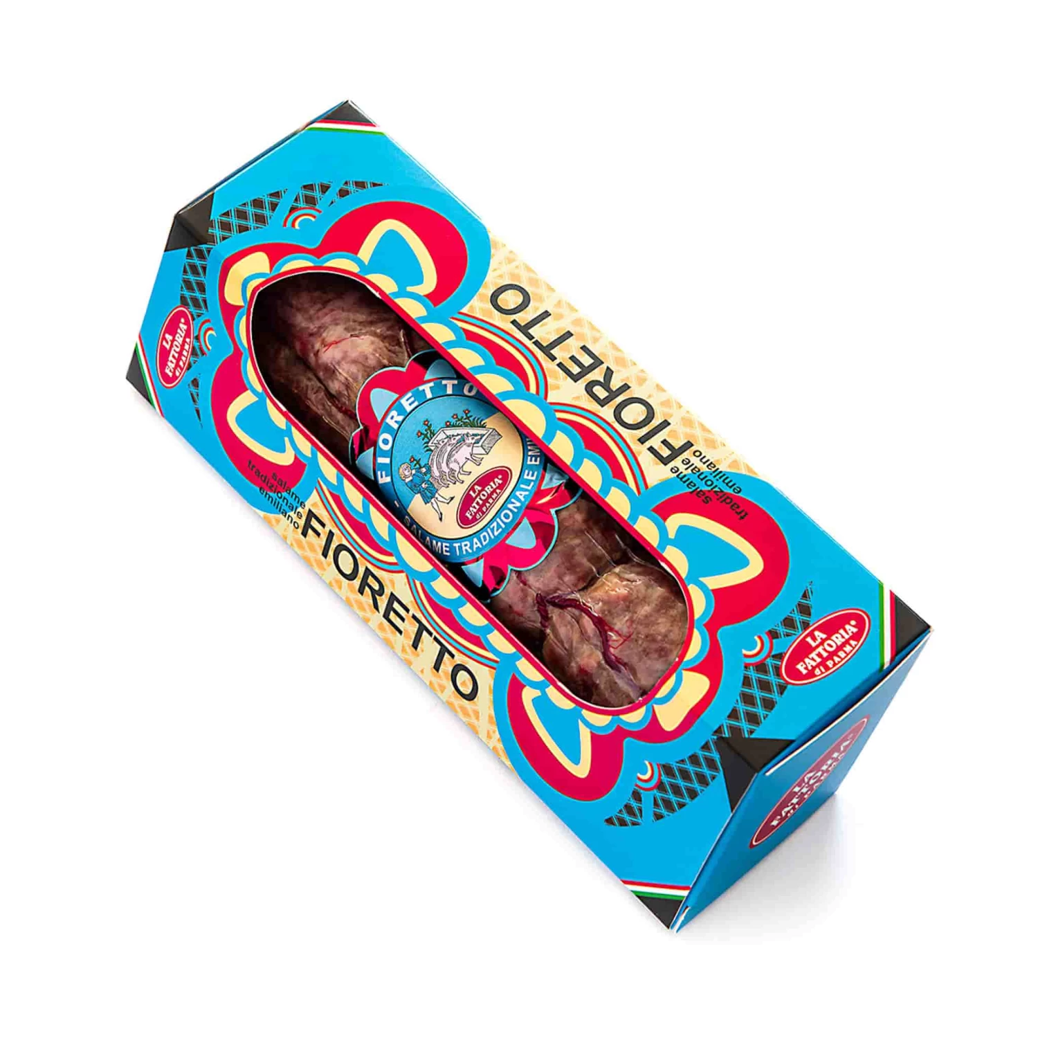 Fioretto salami is native to Emilia-Romagna, a region of northern Italy that is famous for its excellent food and wine. The salami is hand-bound so that the end resembles a flower (fiore in Italian) and is left to cure for no less than 40 days. Fioretto salami is made with top quality pork flavoured with salt, pepper and spices like cinnamon, cloves and nutmeg. The result is a salami that is delicate but well-seasoned, with a light, sweet flavour.