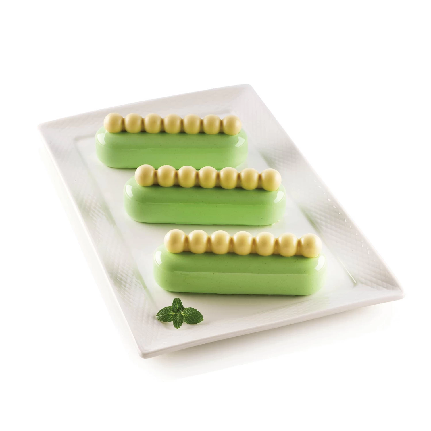 Use Silikomart’s chic éclair silicone mould to create a modern take on the best-loved French patisserie. This mould consists of two parts. One mould for making the choux pastry or sponge base, and a second for making a striking chocolate decoration.
