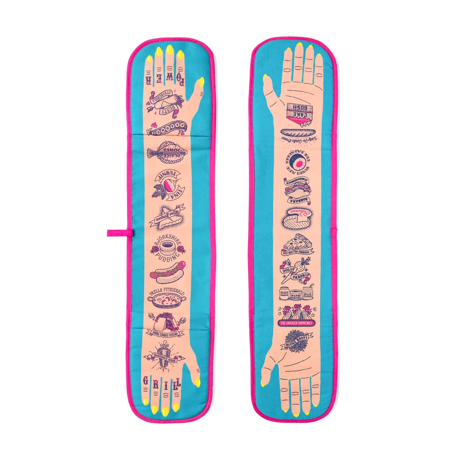 Stuart Gardiner’s ‘Grill Power’ double oven glove celebrates iconic women musicians, with a fun, foodie twist. Featuring tattoos from Dusty Springroll to Björkshire Puddings – this bright blue and pink oven glove is perfect for anyone who loves music as much as food. It’s just the thing to wear as you serve up your Madonna kebabs!