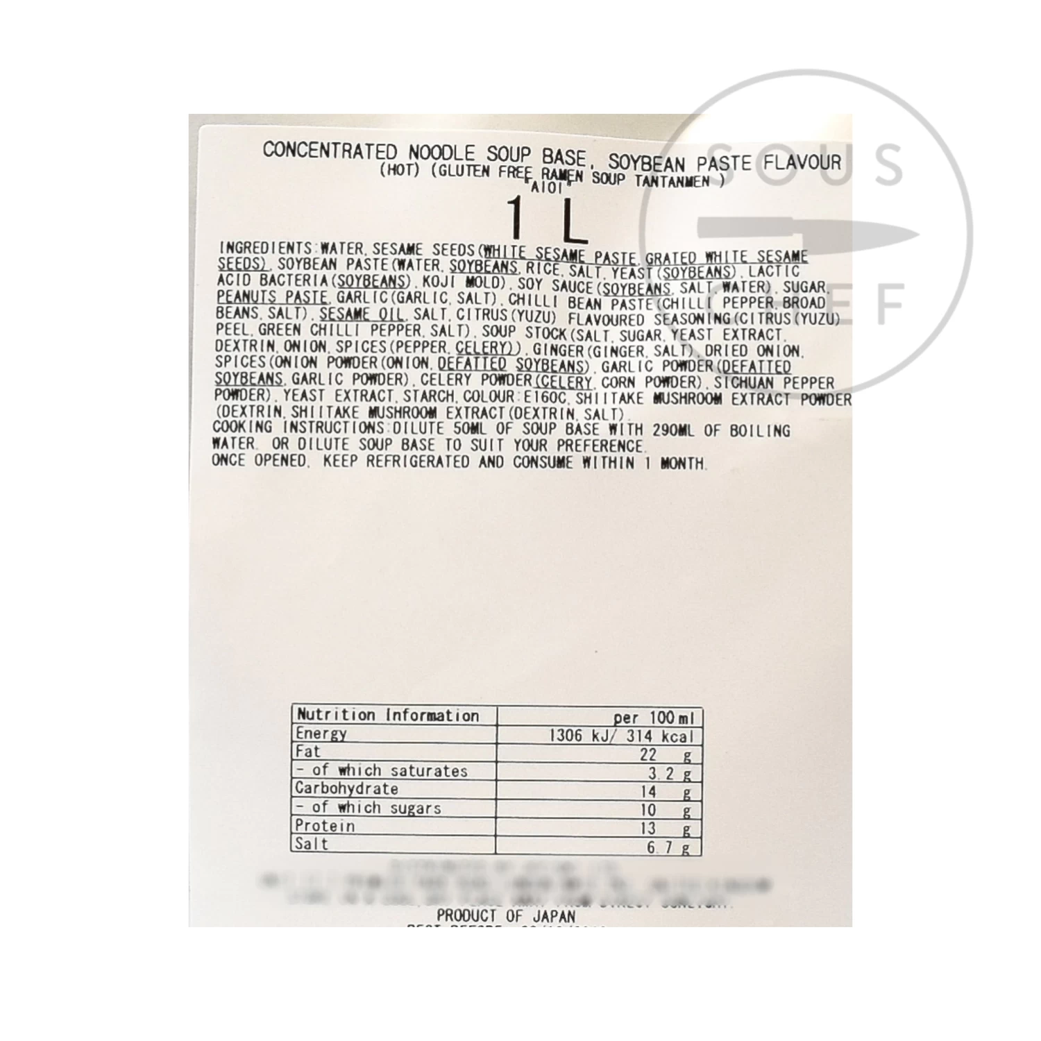 Ingredients: water sesame seeds (white sesame paste, grated white sesame seeds), soybean paste (water, soybeans, rice, salt, yeast (soybeans), lactic acid bacteria, koji), soy sauce (soybeans, salt, water), sugar, peanut paste, garlic (garlic, salt), chilli bean paste (chilli pepper, broad beans, salt), sesame oil, salt, citrus (yuzu) flavoured seasoning (yuzu) (citrus peel [yuzu], green chilli pepper, salt), soup stock (salt, sugar, yeast extract, dextrin, onion, spices [pepper, celery]), ginger (ginger, salt), dried onion, spices (onion powder [onion, deatted soybeans], garlic powder [defatted soybeans, garlic powder], celery powder [celery, corn powder], Sichuan pepper powder), yeast extract, starch, colour: E160C, shiitake mushroom extract powder (dextrin, shiitake mushroom extract [dextrin, salt]). Contains allergens: soya, sesame, peanuts, celery.