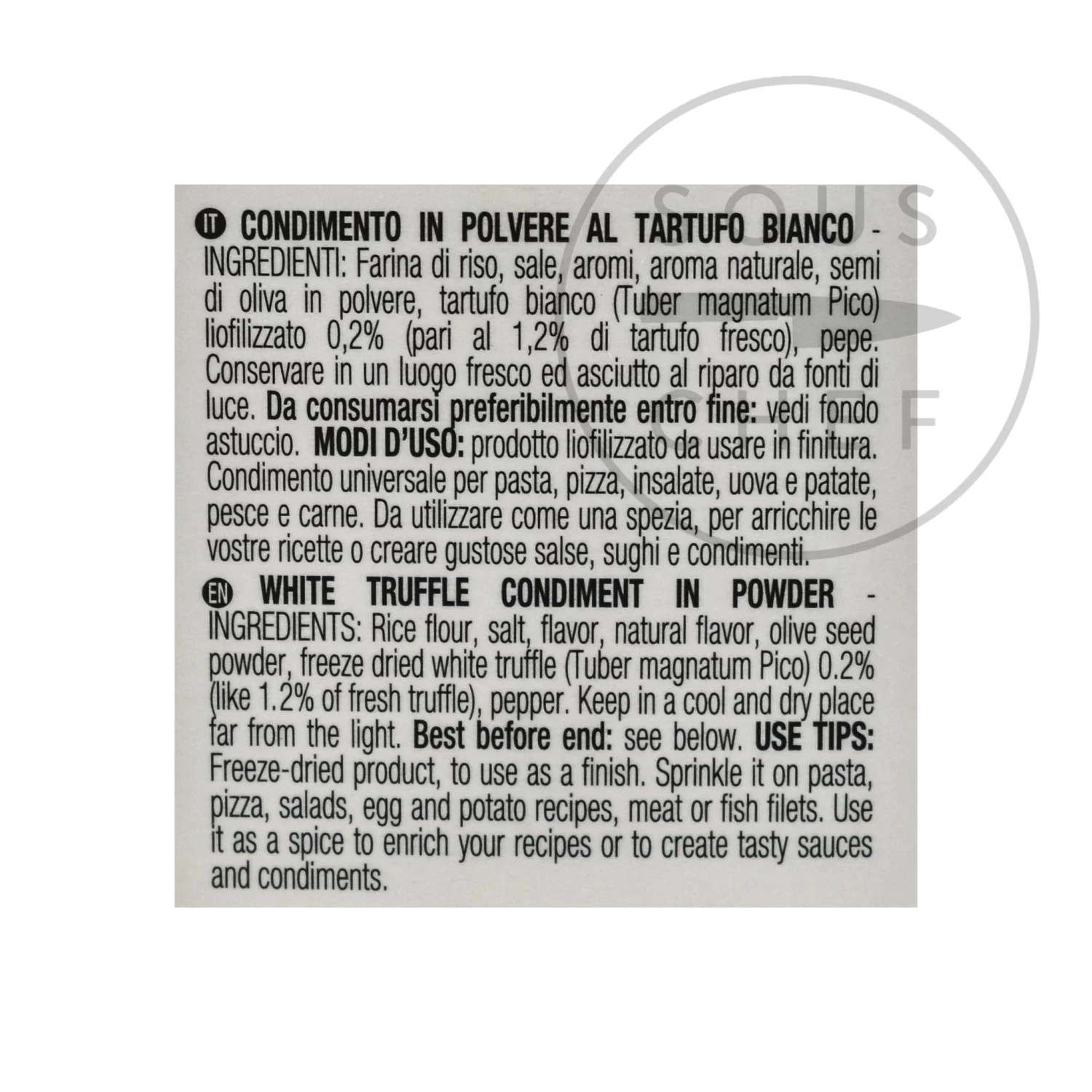 Ingredients: Rice flour, salt, flavour, natural flavour, olive seed powder, freeze dried white truffle (tuber magnatum pico) 0.2% (like 1.2% of fresh truffle), pepper.