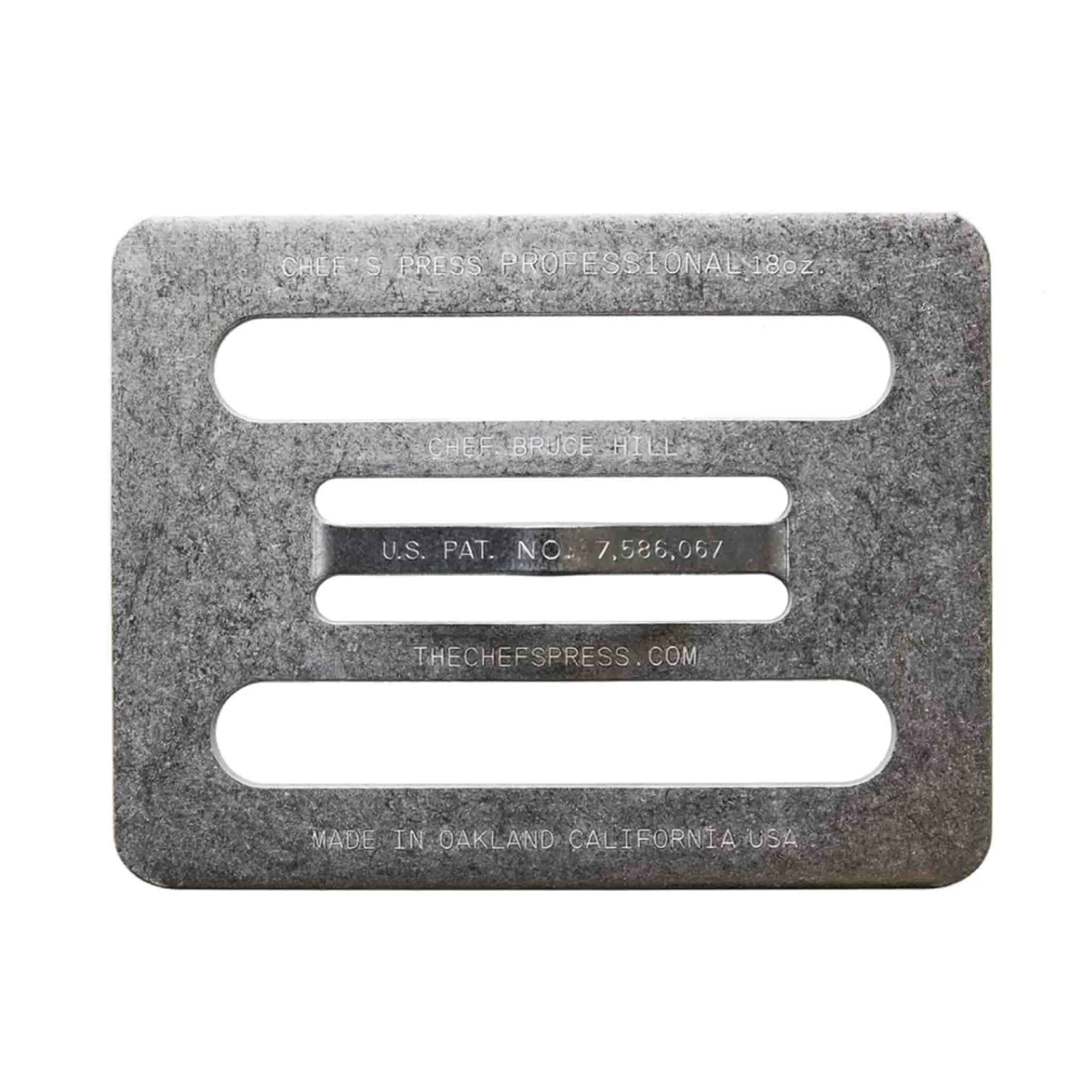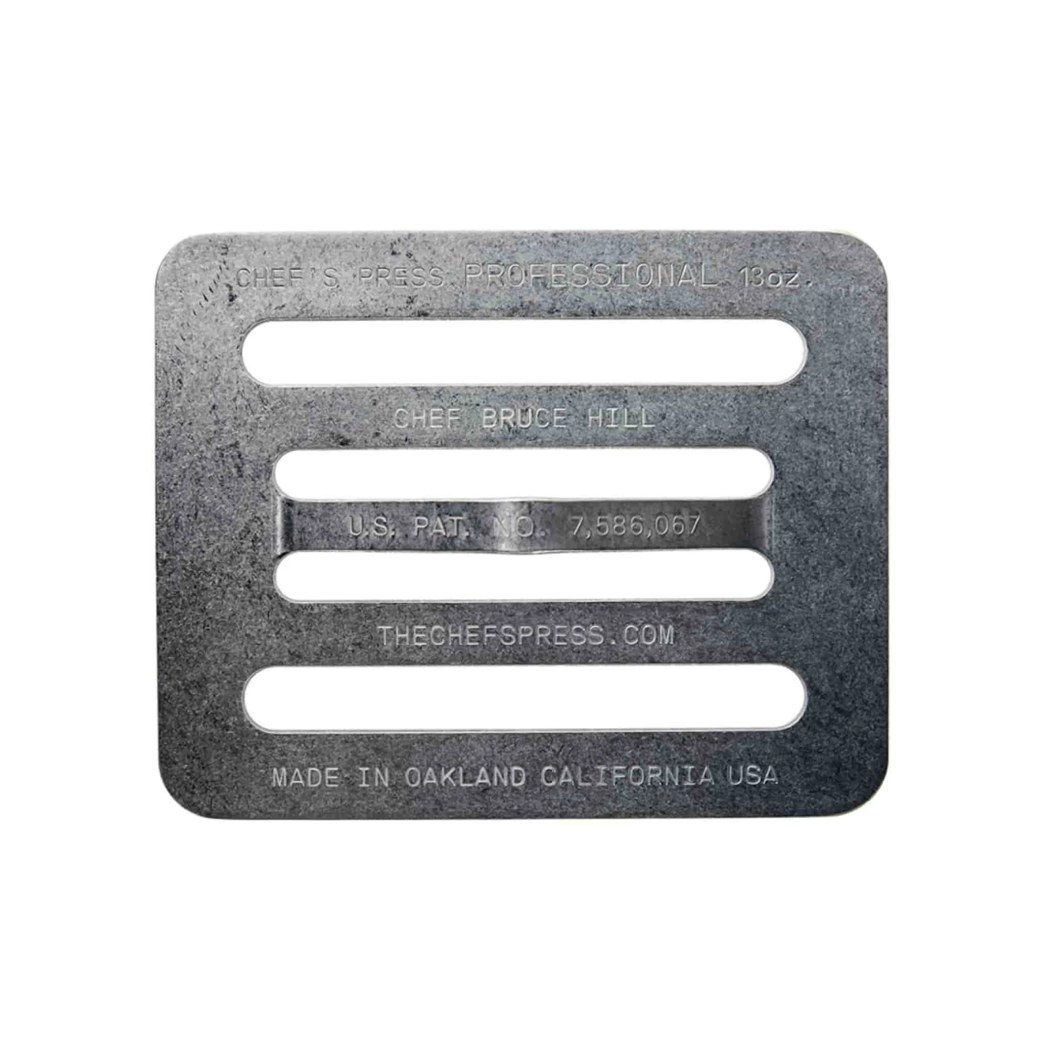 The Chef’s Press was created by Chef Bruce Hill while he was working in a tiny kitchen of Bix Restaurant in San Francisco. The traditional cast iron weights were too heavy for many dishes and also trapped steam.