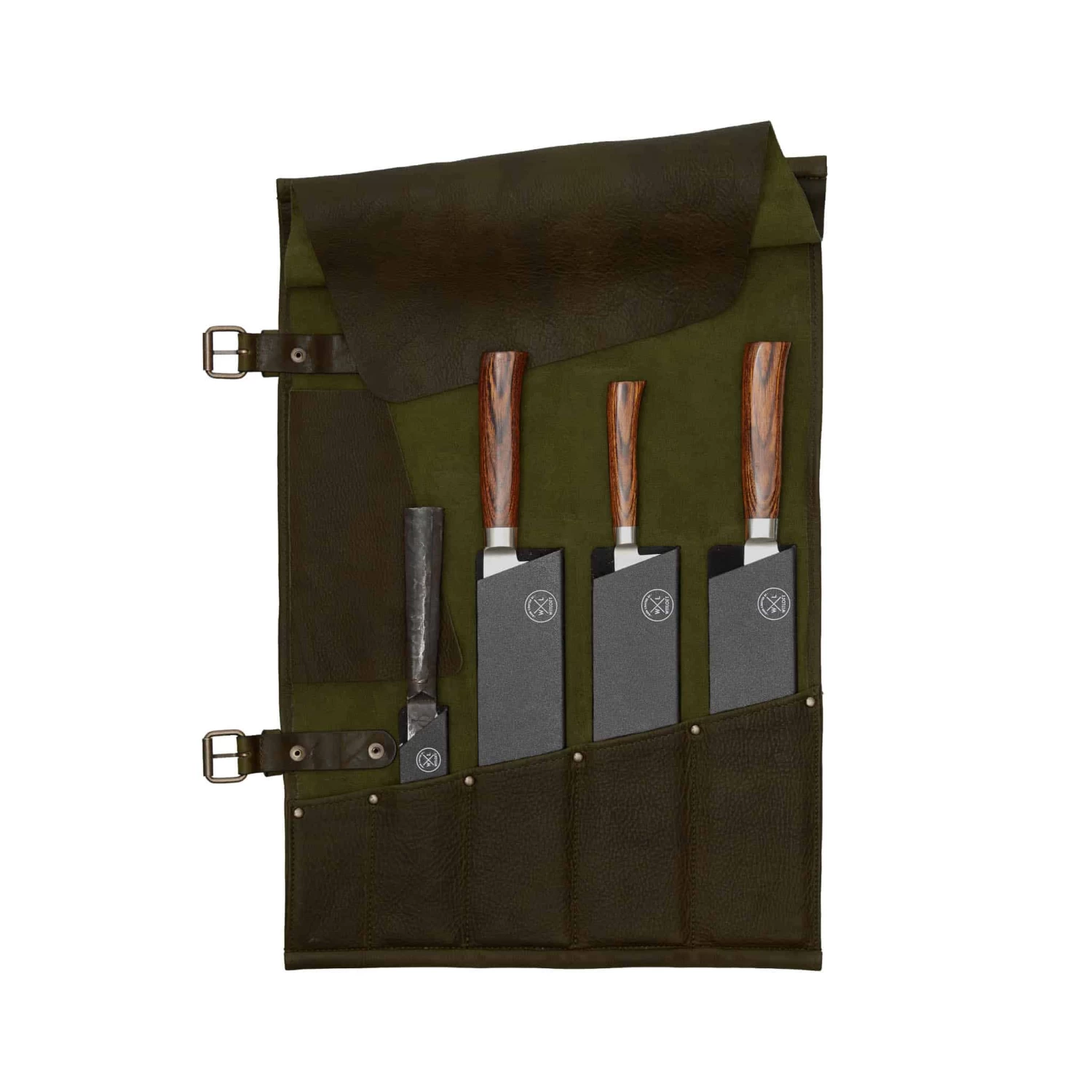 Witloft’s leather 5-pocket knife roll in green is the chic way to carry your knives on-the-go. Made from 100% cow leather, the roll includes knife guards to stop the knives from sliding from their pockets and to protect them, too.